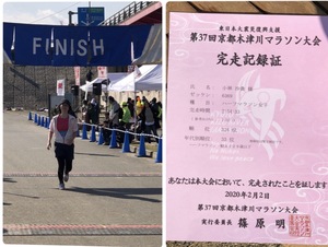 (↑ゴールの瞬間、ヘロヘロの私と完走証)