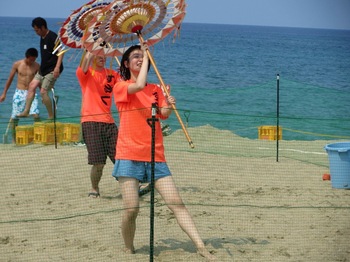 海を背に、しゃんしゃん傘踊りを披露!!